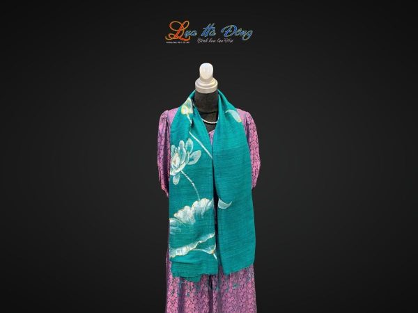 Khăn lụa đũi vẽ tay hoa sen nền xanh lá 65x176cm 100% silk KLTA617-8