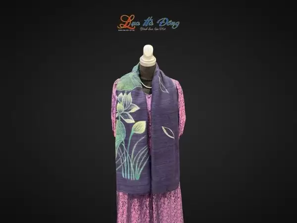 Khăn Lụa vẽ Tay họa tiết hoa sen nền tím 90x180cm 100% silk KLTA918-3