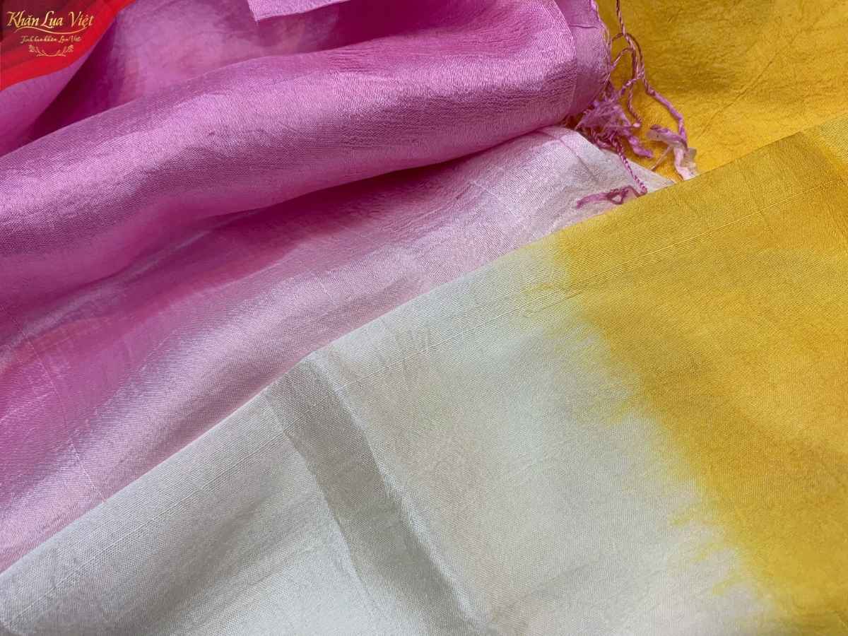 Điểm nhấn đắt giá nhất của dòng sản phẩm này chính là kỹ thuật nhuộm loang thủ công. Mỗi chiếc khăn là một sự thử nghiệm về sắc độ đầy ngẫu hứng: