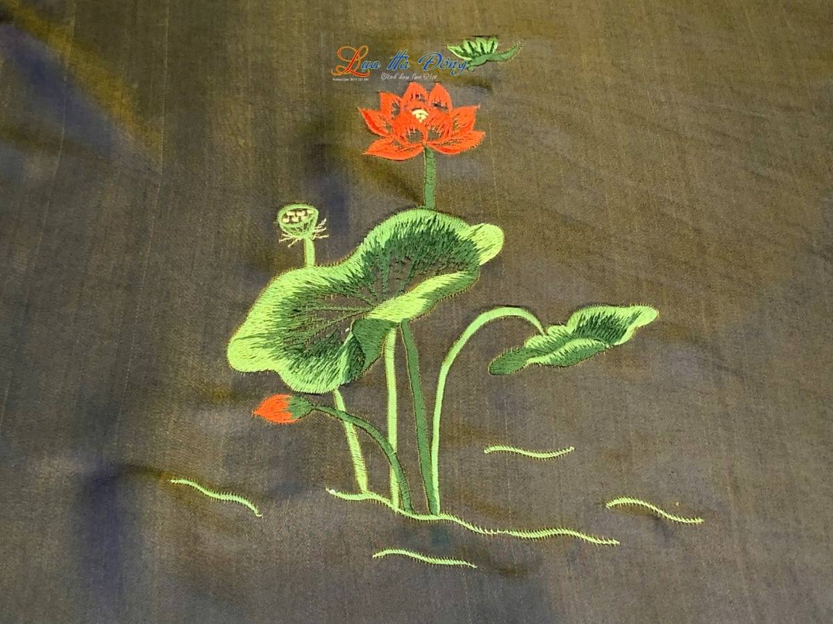 Trên nền lụa trơn, họa tiết hoa sen thêu tay được các nghệ nhân tỉ mỉ thực hiện. Những đường kim, mũi chỉ tinh xảo, uyển chuyển khắc họa một cách chân thực hình ảnh đóa sen đang hé nở, mang đến vẻ đẹp nhẹ nhàng, tinh tế và đầy ý nghĩa.
