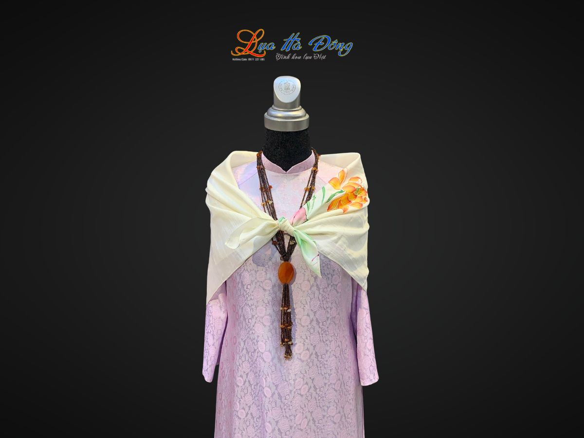 Khăn lụa tơ tằm vẽ tay sen màu tím nhạt LNL75180/5						 Khăn lụa vân cổ thêu tay mai vàng MNV-LNL80170/2